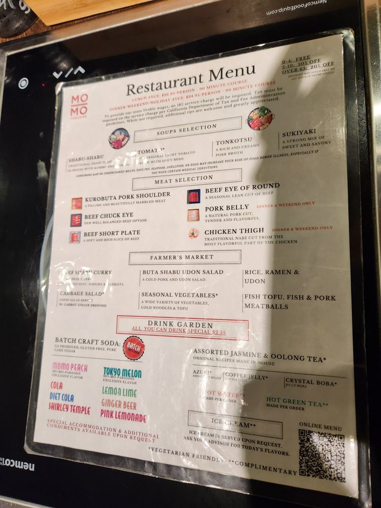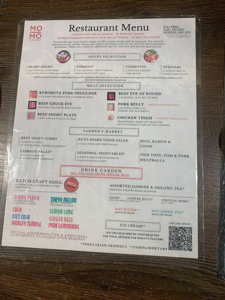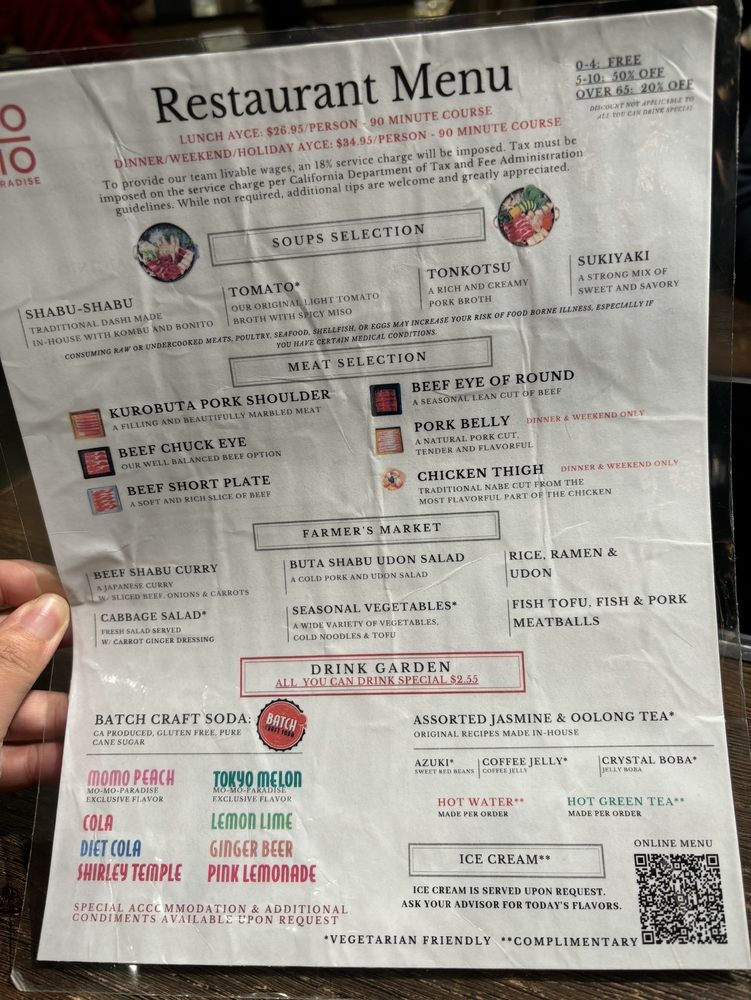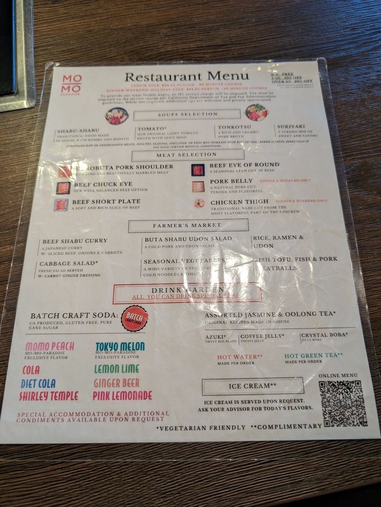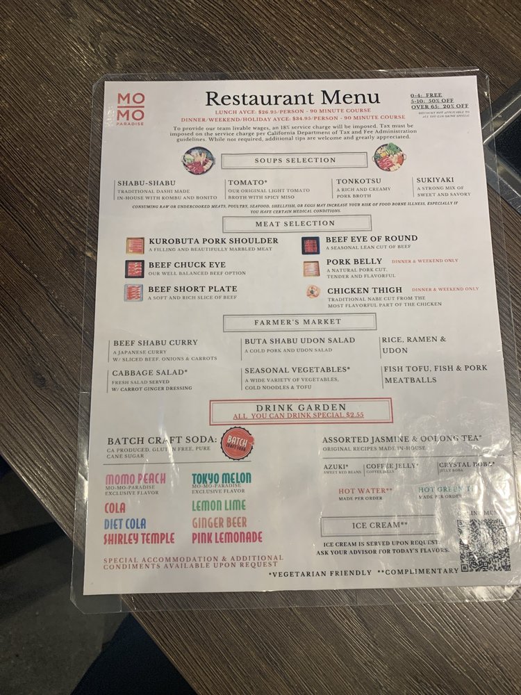 Introducing the menu at Momo Paradise, a Japanese hot pot restaurant, offers a range of options catering to various dietary preferences such as vegan and vegetarian. Located in Arcadia, CA, this Asian-owned establishment provides a casual yet trendy atmosphere, perfect for brunch, lunch, or dinner. Customers rave about the quality of meat, with options like beef chuck eye and pork belly receiving high praise. The broth selection, including sukiyaki and tonkotsu, adds a flavorful touch to the meal. Complement your choices with a visit to the drink garden, offering unique beverages like jasmine milk tea and momo peach soda. The service is both efficient and friendly, making your dining experience at Momo Paradise a delightful one. Remember to make a reservation to avoid waiting, and don't miss out on the ice cream scoop offered at the end of your meal.