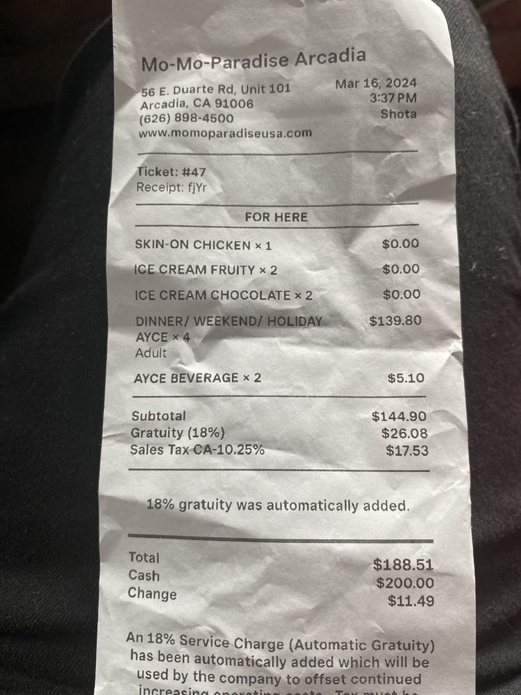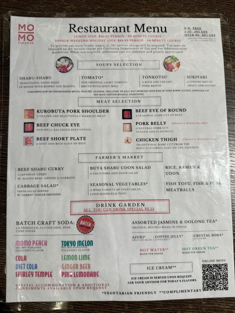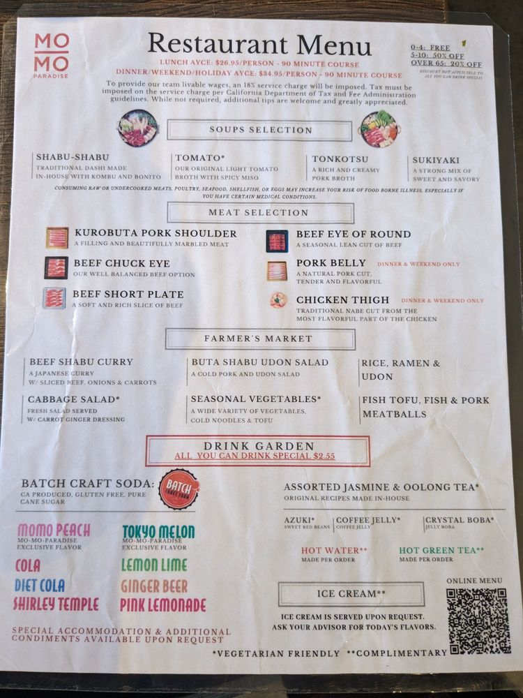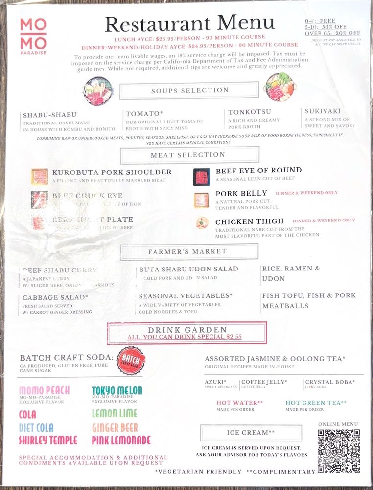 Introducing the menu at Momo Paradise, a Japanese hot pot restaurant, offers a range of options catering to various dietary preferences such as vegan and vegetarian. Located in Arcadia, CA, this Asian-owned establishment provides a casual yet trendy atmosphere, perfect for brunch, lunch, or dinner. Customers rave about the quality of meat, with options like beef chuck eye and pork belly receiving high praise. The broth selection, including sukiyaki and tonkotsu, adds a flavorful touch to the meal. Complement your choices with a visit to the drink garden, offering unique beverages like jasmine milk tea and momo peach soda. The service is both efficient and friendly, making your dining experience at Momo Paradise a delightful one. Remember to make a reservation to avoid waiting, and don't miss out on the ice cream scoop offered at the end of your meal.